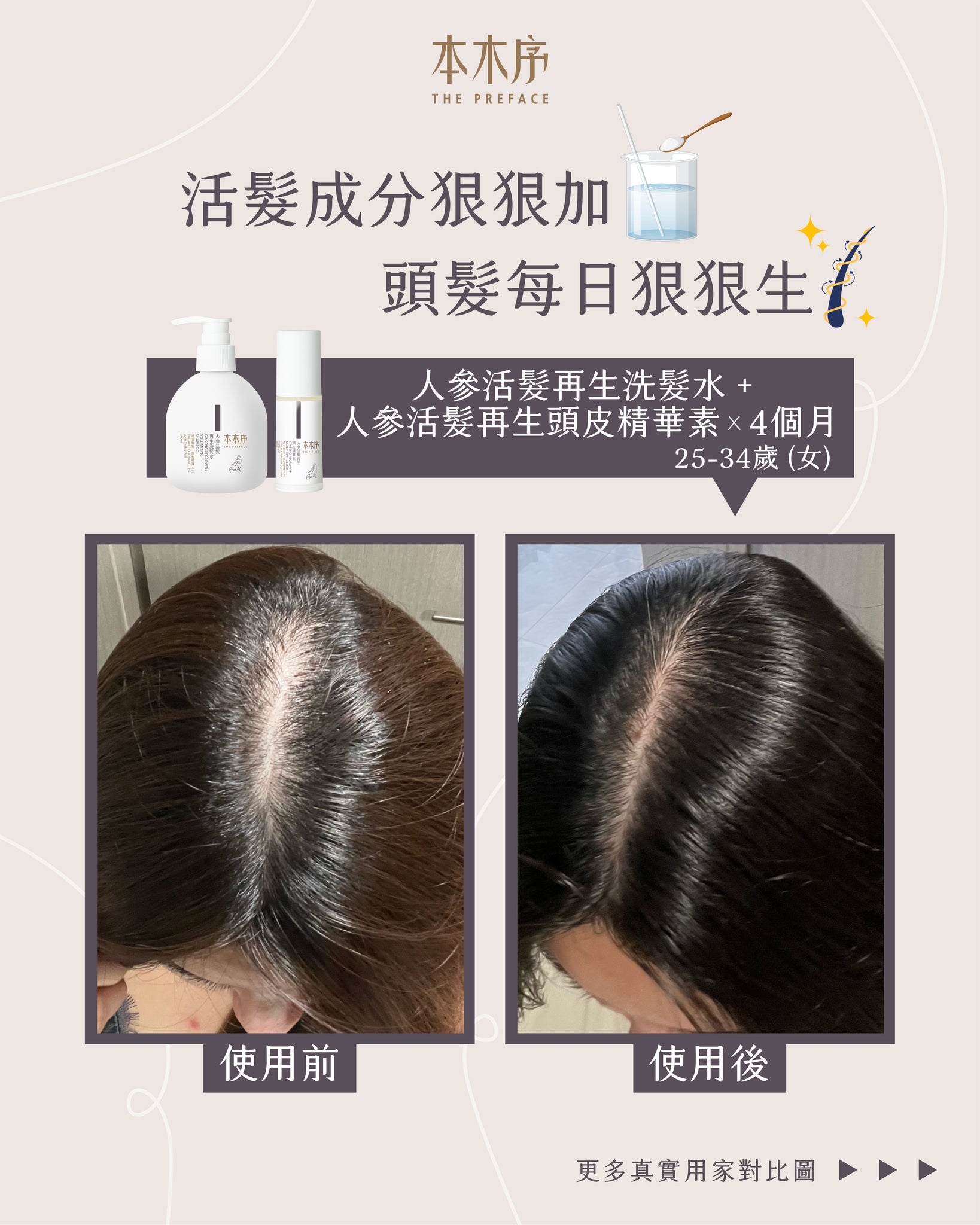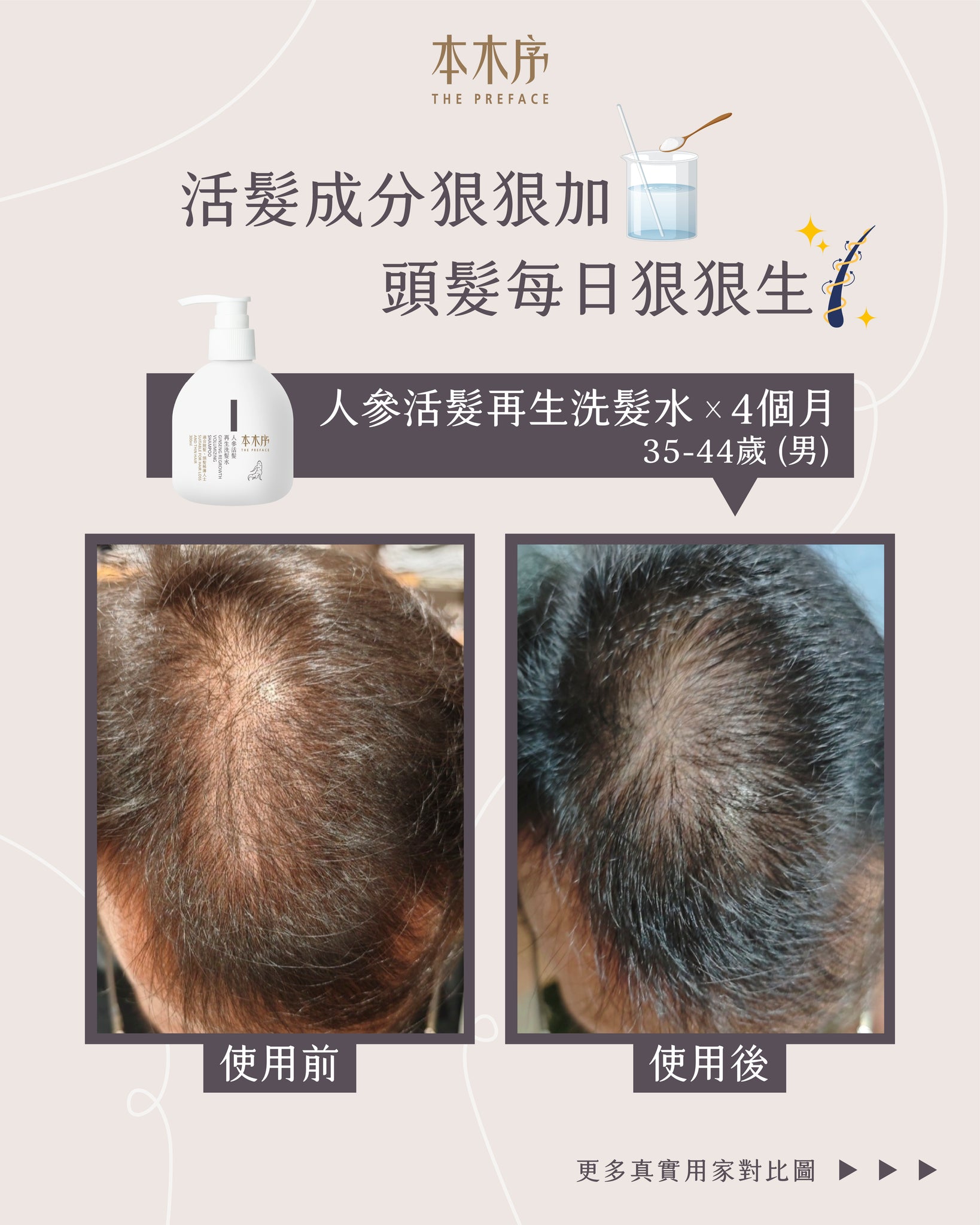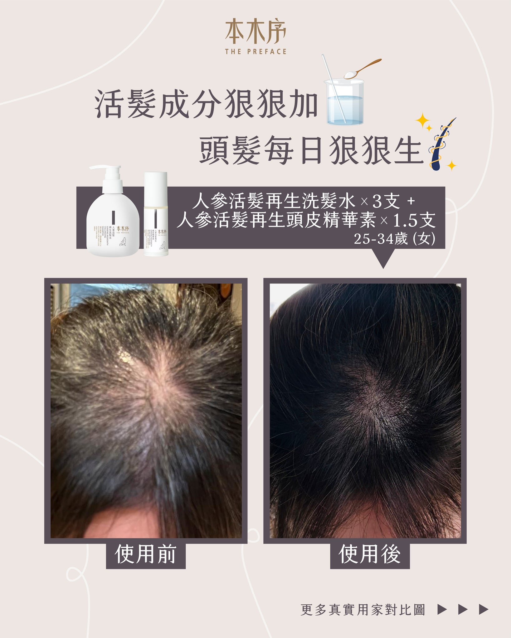 弱酸性氨基酸洗髮水,溫和清潔頭皮污垢、疏通毛孔;人參等傳統植萃抗炎、抑菌、強韌髮絲、改善血液循環;活髮防脫之星級成分Kopexil及Kopyrrol,防止毛囊萎縮及死亡、抑制5α-還原酶活性,改善雄性脫髮,同時抑制賴氨酸羥化酶,刺激毛囊、毛乳頭细胞的增殖,擴張血管、增長髮絲成長周期;除了活髮外,它更能減少油脂分泌,改善頭皮出油、頭瘡,及頭髮扁蹋問題;男女均適用。 - 人參活髮再生頭皮精華素 30ml