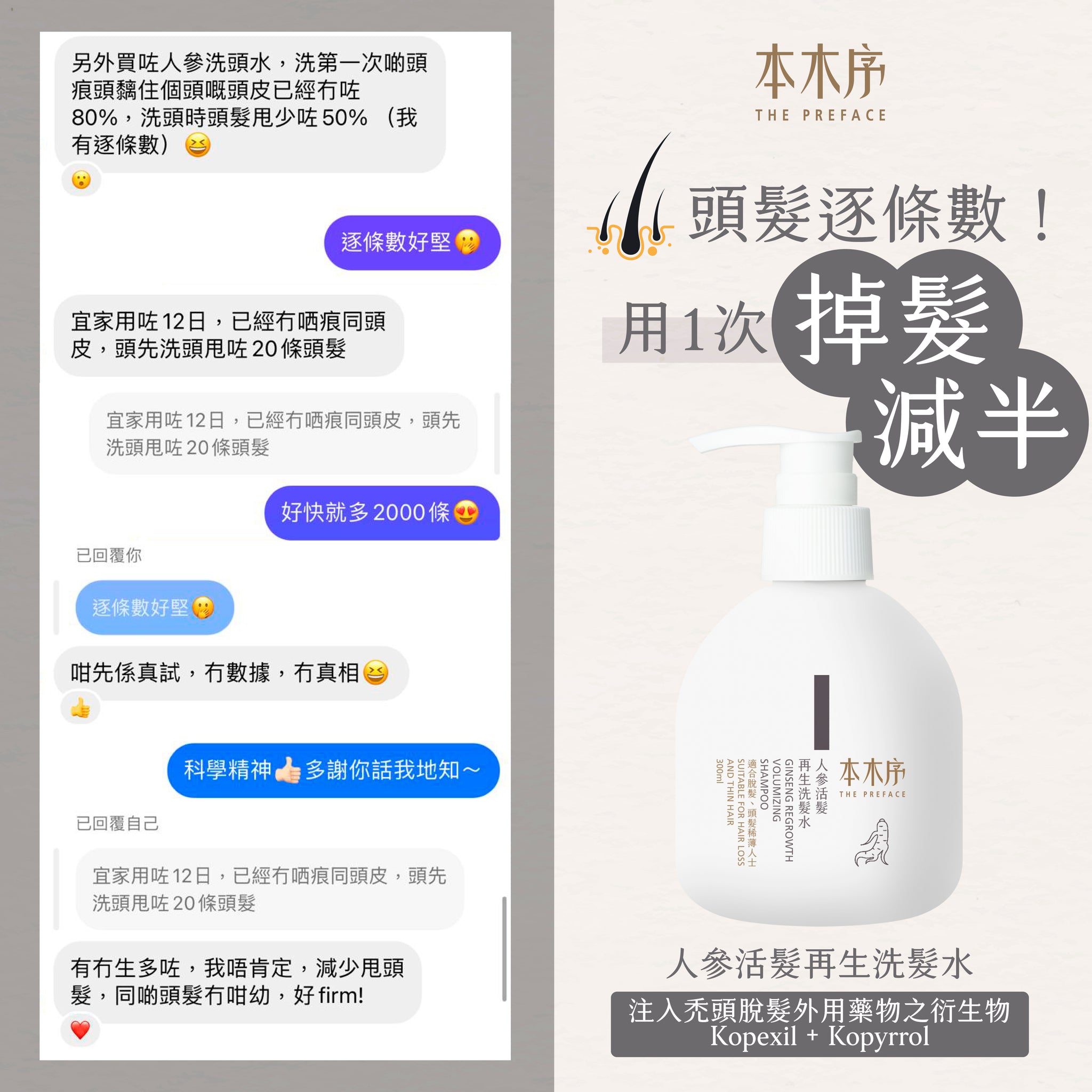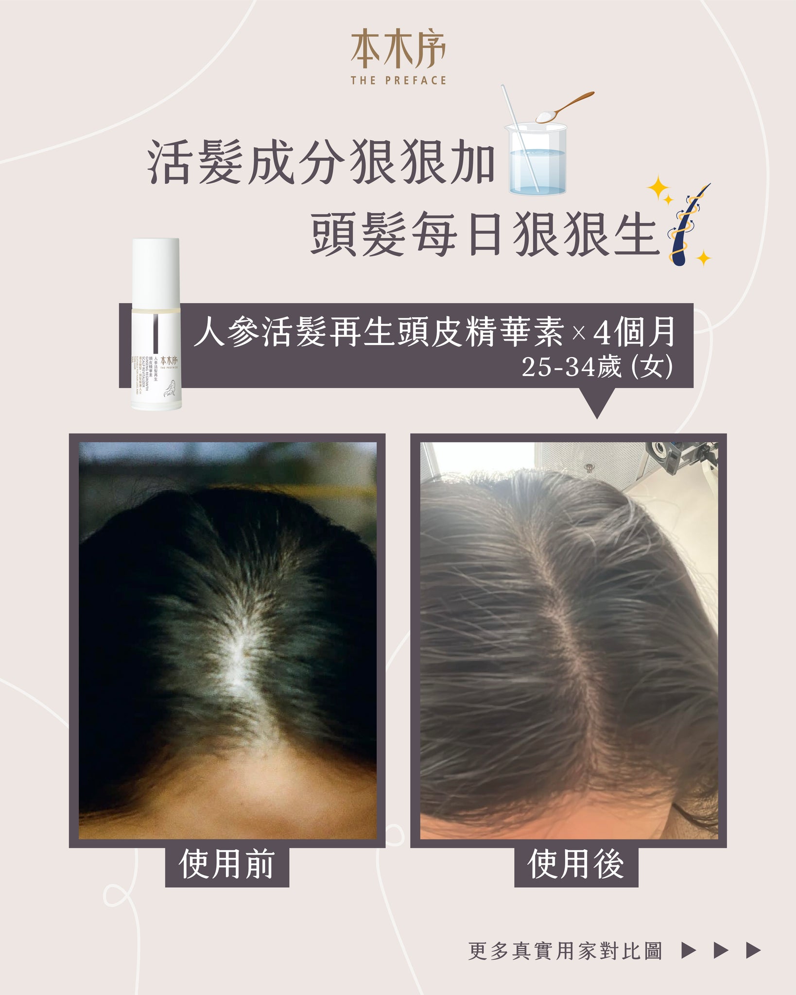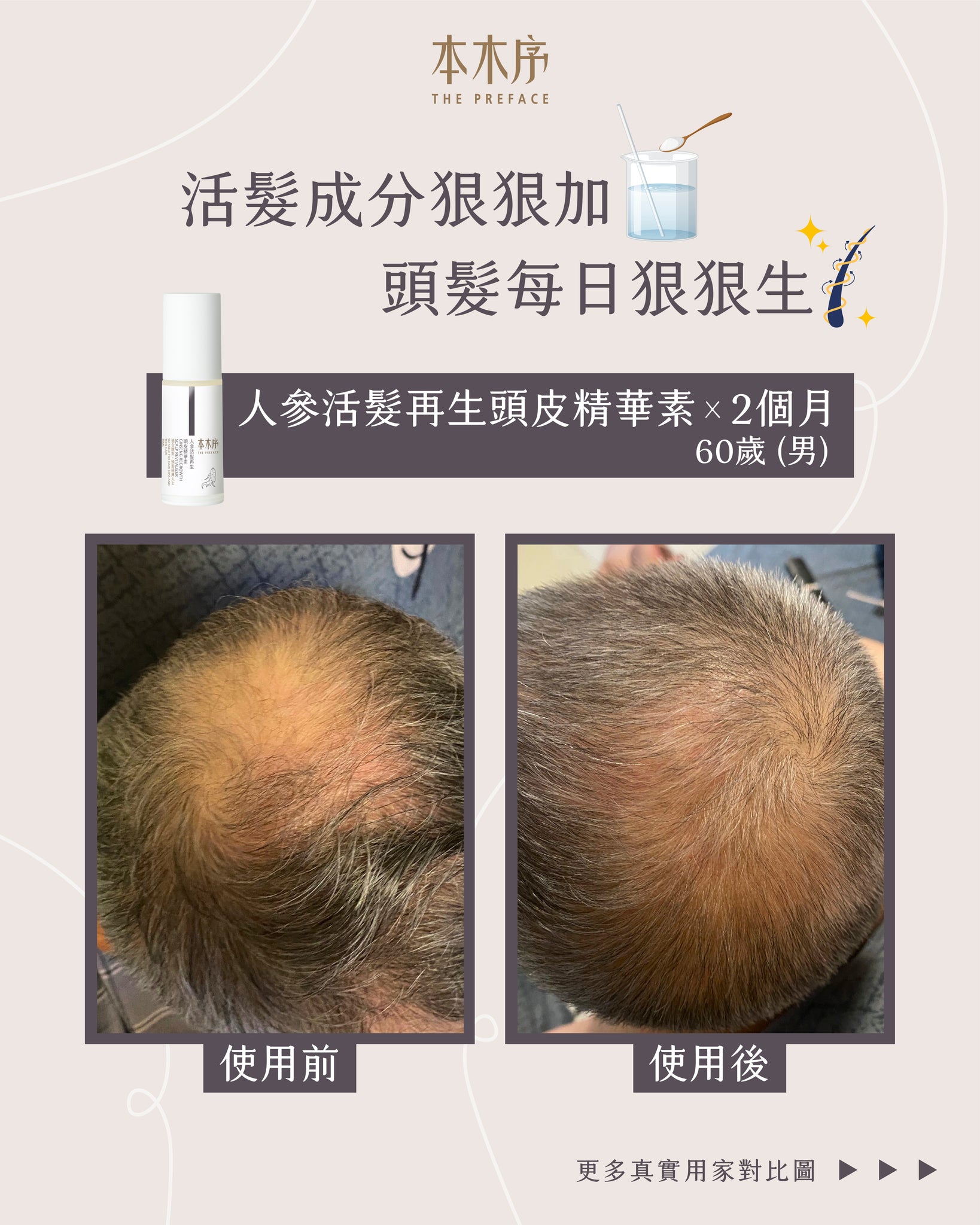 弱酸性氨基酸洗髮水,溫和清潔頭皮污垢、疏通毛孔;人參等傳統植萃抗炎、抑菌、強韌髮絲、改善血液循環;活髮防脫之星級成分Kopexil及Kopyrrol,防止毛囊萎縮及死亡、抑制5α-還原酶活性,改善雄性脫髮,同時抑制賴氨酸羥化酶,刺激毛囊、毛乳頭细胞的增殖,擴張血管、增長髮絲成長周期;除了活髮外,它更能減少油脂分泌,改善頭皮出油、頭瘡,及頭髮扁蹋問題;男女均適用。 - 人參活髮再生頭皮精華素 30ml