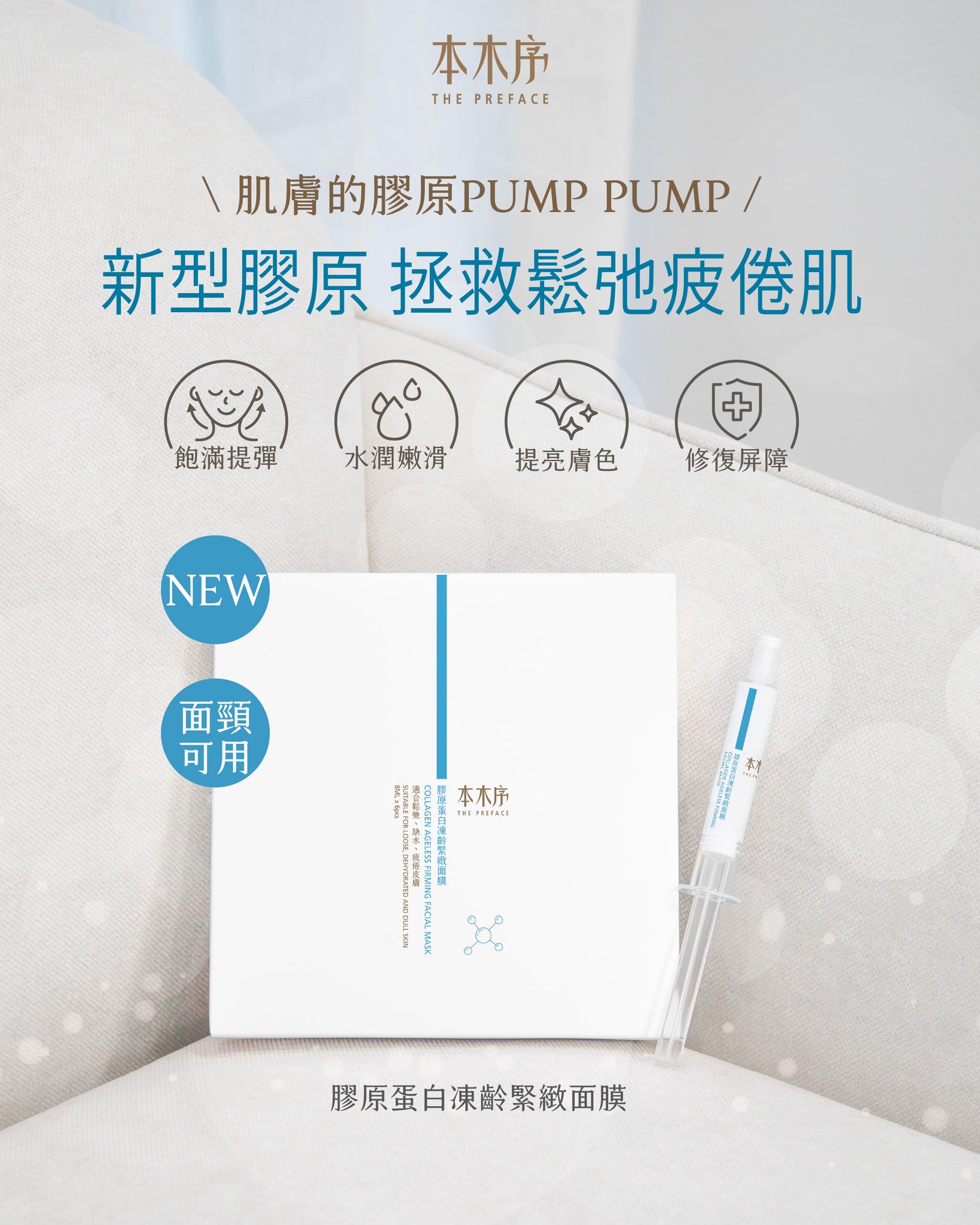 亞洲白樺被譽為生命之樹,其汁液蘊含礦物質、胺基酸及抗氧化物,減輕皮膚炎症,同時能打開皮膚水通道,有助其他修復成分為表層及肌底提供滋養;琉璃苣、密羅木葉、積雪草為強效紓緩組合,有助褪紅、癒合傷口、重建皮膚屏障;精挑細選的冰晶感面膜紙透氣、柔軟、非常服貼,自帶透明質酸,久敷不乾;此面膜為受傷、受熱、發炎的皮膚帶來即時清涼感覺、深度注水及鎮靜之效,適合完成激光、射頻、微針等創傷性療程後的皮膚,亦推介給曬傷、缺水、敏感、屏障受損及關注玫瑰痤瘡人士使用。 - 膠原蛋白凍齡緊緻面膜 (8ml x 6pcs)
